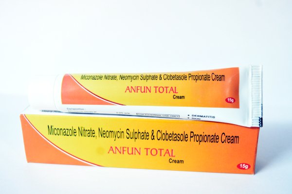 Anfun Total Cream is a combination medicine that consists of clobetasol, miconazole and neomycin. It is used for the treatment of bacterial and fungal infections of the skin. It works by killing or stopping the growth of microorganisms that causes infection. It provides relief from symptoms of infection like swelling, redness etc.